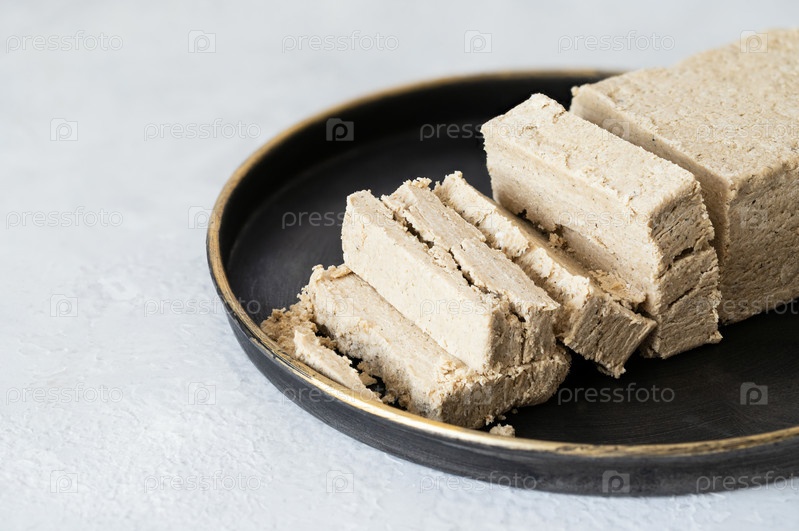 Нарезанная халва в черной тарелке на белом фоне. Подсолнечная халва крупным планом. Восточный десерт