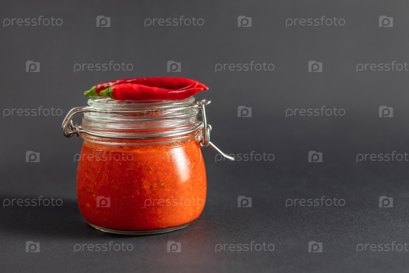Паста из острого перца чили харисса. Аджика. Традиционная тунисская, грузинская и арабская кухня. Домашняя харисса из роз в стеклянной банке