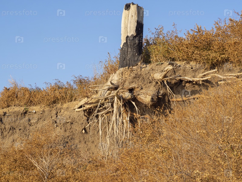 Ствол мертвого дерева с открытыми корнями на глиняной скале на фоне неба. Сгоревший сухой пень торчит из береговой скалы в желтой траве