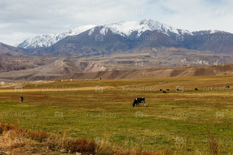 Коровы пасутся на пастбище у гор в Кыргызстане