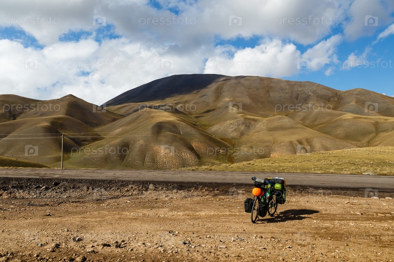 Велосипед путешественника с сумками стоит рядом с дорогой на фоне гор, ландшафта, Кыргызстана, туристического велосипеда