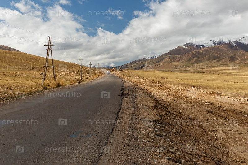 Асфальтовая дорога в горах. Автодорога А367 проходит в Нарынской области Кыргызстана, у села Узунбулак Кочкорского района