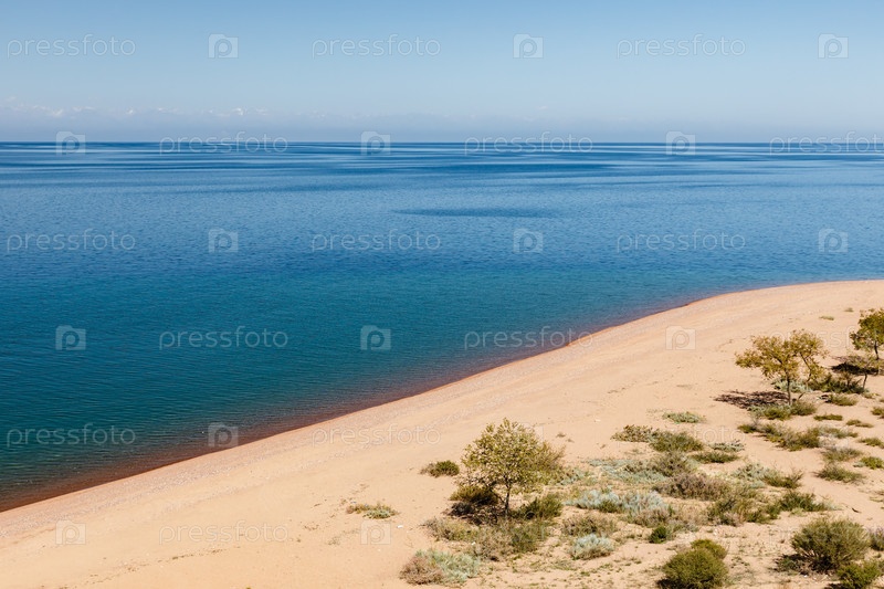 Озеро Иссык-Куль, Кыргызстан, пустой песчаный пляж на южном берегу озера