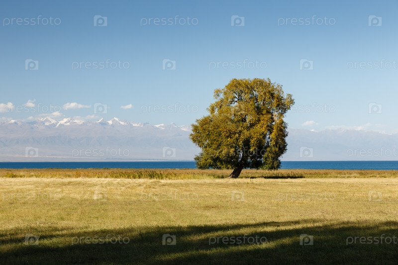 Одинокое лиственное дерево на берегу озера Иссык-Куль
