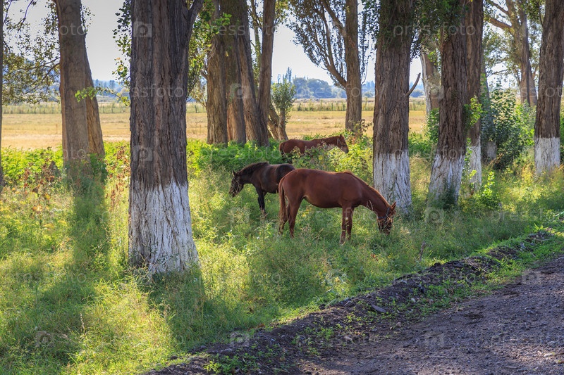 Три лошади пасутся между деревьями у дороги, Кыргызстан