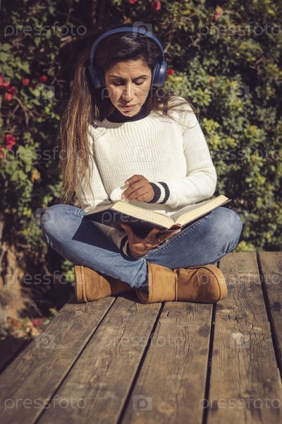 Латиноамериканка, сидящая на открытом воздухе на деревянном столе со скрещенными ногами, слушающая музыку и читающая, в саду своего дома в солнечный день