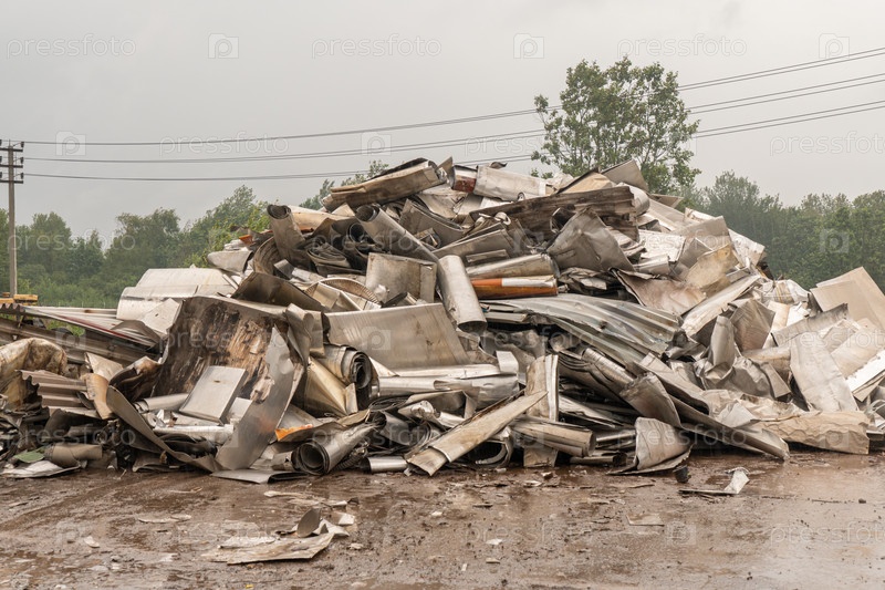 Металлолом на площадке готовый к переработке. Промышленный объект для сбора и переработки металлолома. Концепция вторичных ресурсов