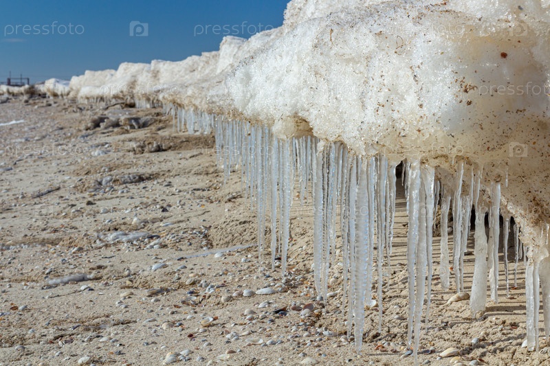 Крупный план ледяного берега, замерзших волн, скал и солнечных бликов на льду