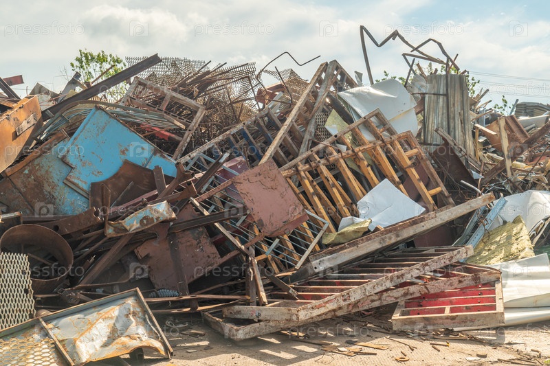 Металлолом на площадке готовый к переработке. Промышленный объект для сбора и переработки металлолома. Концепция вторичных ресурсов