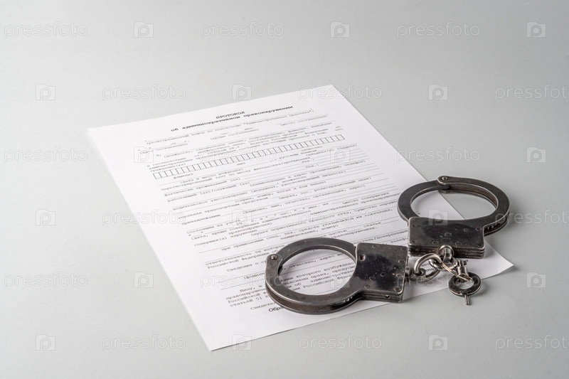 Наручники, ручка и чистый лист бумаги на столе. Откровенное признание, арест, допрос. Наказание за противоправные действия