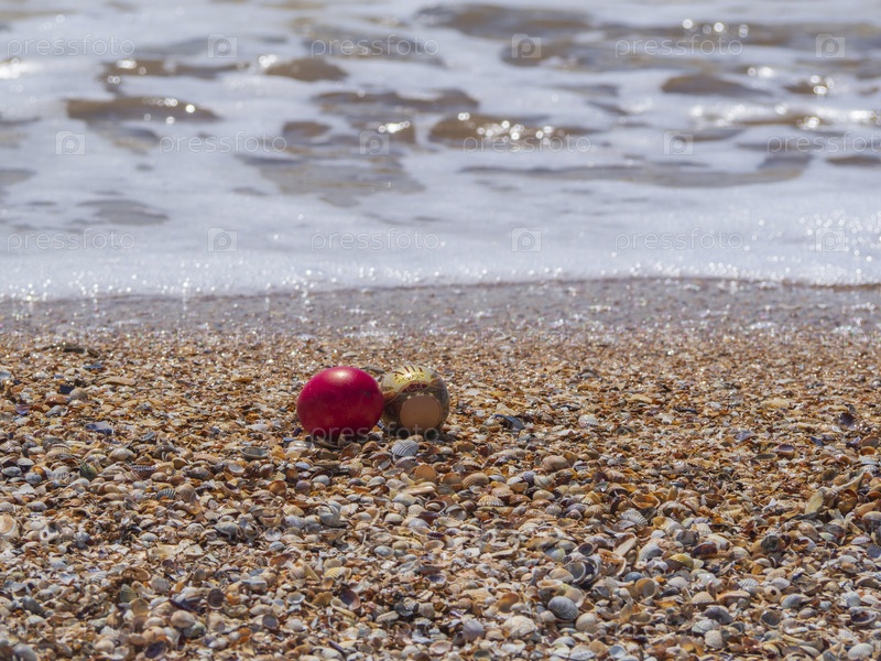 Пасхальные яйца на пляже. Два окрашенных пасхальных яйца лежат на ракушках морского пляжа у кромки воды на размытом фоне морской пены. Пляж счастливой Пасхи фон