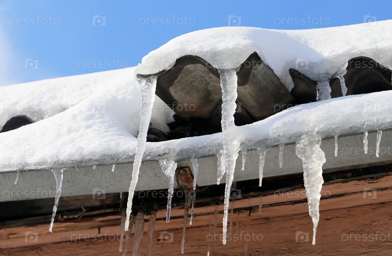 Сосульки висят на заснеженной крыше дома на фоне голубого неба
