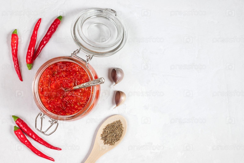 Паста из острого перца чили харисса. Аджика. Традиционная тунисская, грузинская и арабская кухня. Домашняя харисса из роз в стеклянной банке
