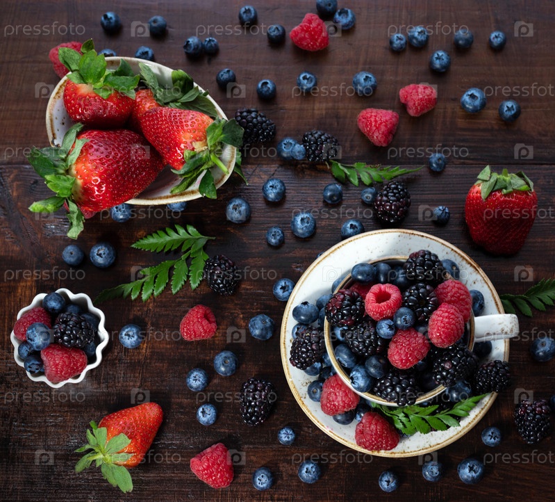 Ягодная смесь на деревянном фоне. Ягоды в чашке и миске. Клубника, черника, ежевика и малина. Летний фон. Вид сверху, плоская планировка
