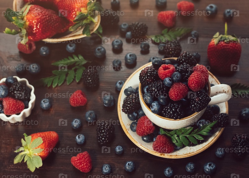 Чашка чая с ягодами крупным планом на темном деревянном фоне. Малина, ежевика, черника в чашке. Летний ягодный микс