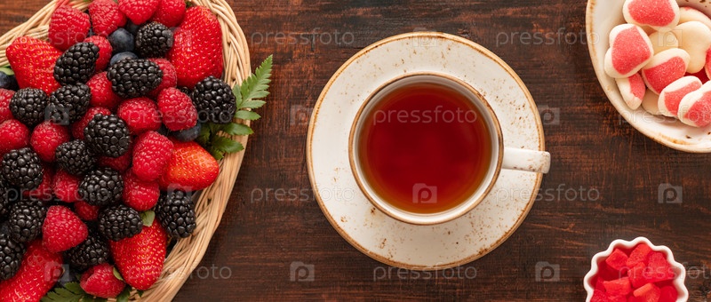 Чашка чая на столе с ягодами и сладостями. Баннер. Ягодный чай на деревянном фоне. Концепция пищевого чая. Вид сверху
