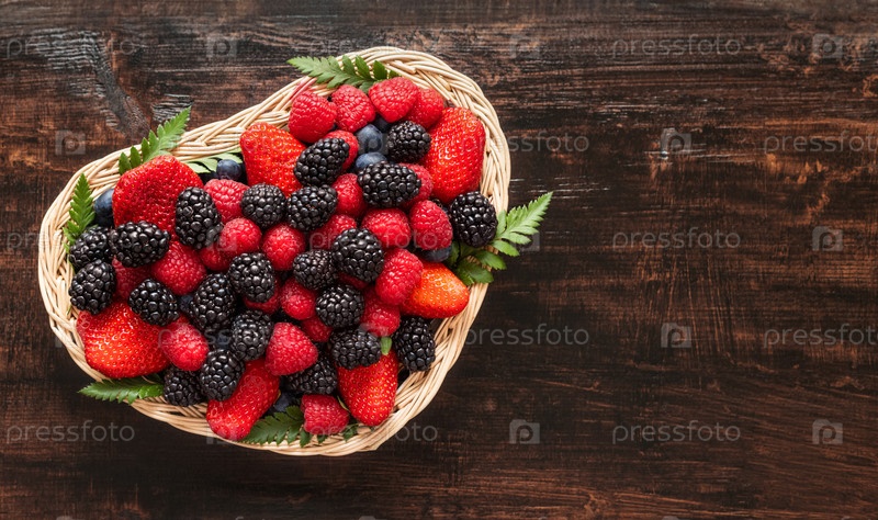 Сердце ягод. Свежая спелая малина, ежевика, клубника и черника на темном деревянном фоне в корзине. Ягодный микс. Скопируйте пространство