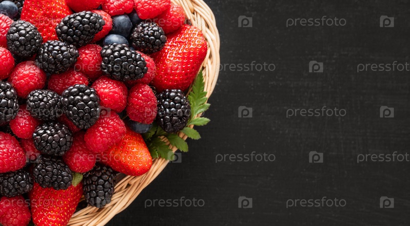 Ягоды в корзине крупным планом. Свежая спелая малина, ежевика, клубника и черника на черном фоне. Ягодный микс. Скопируйте пространство