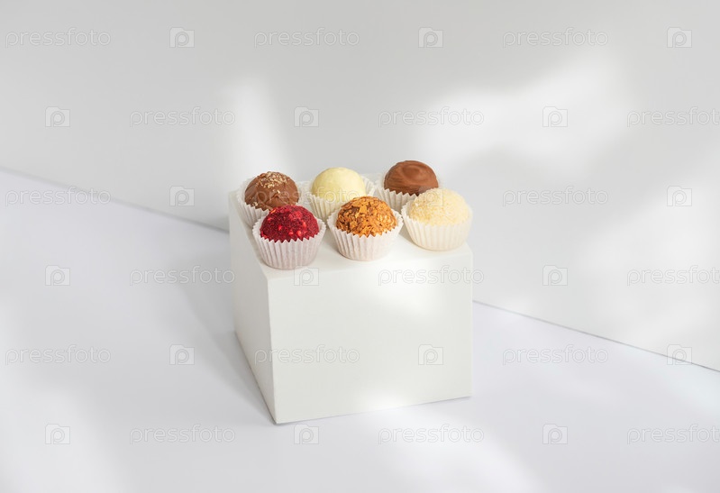 Геометрическая композиция с конфетами на белом кубе. Трюфели на белом фоне. Изометрический. Скопируйте пространство