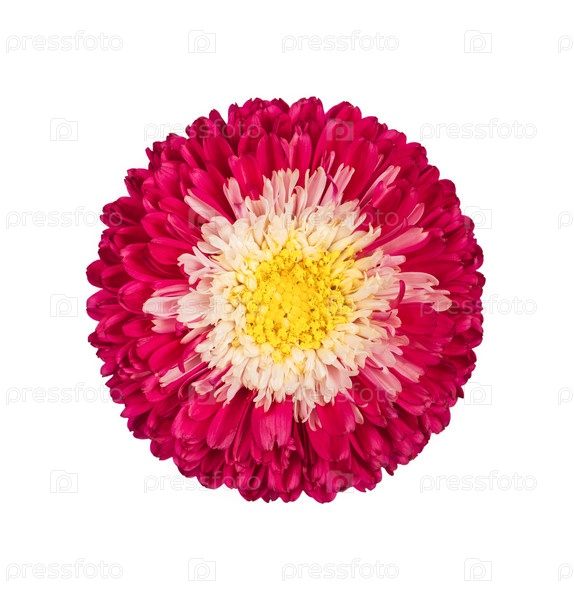 Красивый розовый цветок астра, изолированный на белом фоне. Callistephus chinensis с ярко-розовыми листьями и желтой серединой. Астра в крупном плане
