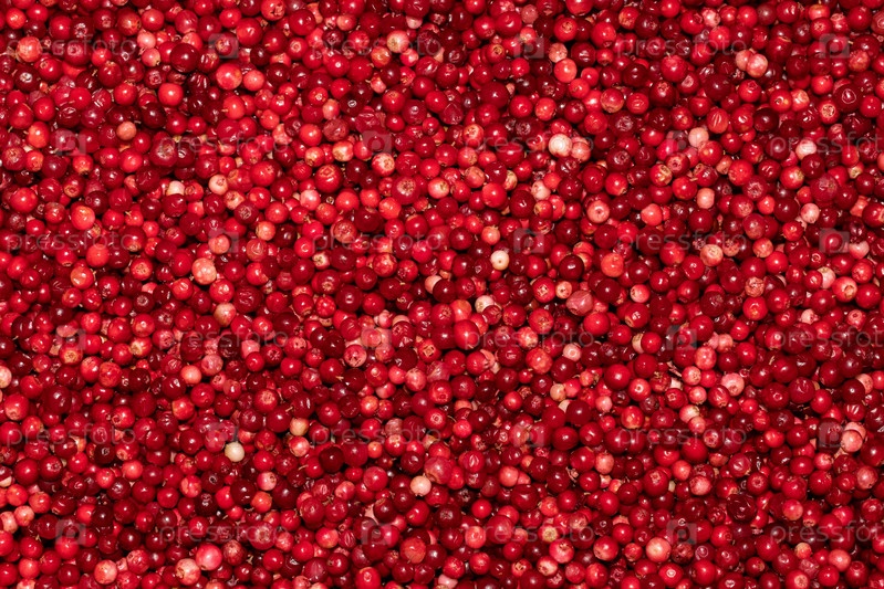 Красные спелые свежие ягоды клюквы крупным планом. Фруктовый фон. Брусника, красная черника, красная черника, лисичка, красный черничный фон. Ягодный узор и текстура. Продовольственный фон