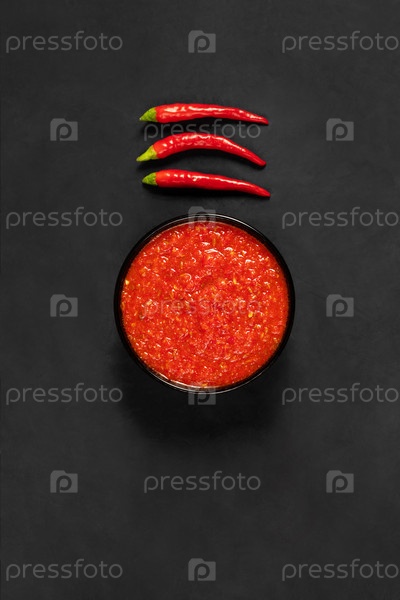 Паста из острого перца чили харисса. Аджика на черном фоне. Традиционная тунисская, грузинская и арабская кухня. Домашняя розовая харисса в миске