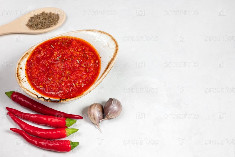 Паста из острого перца чили харисса. Аджика. Традиционная тунисская, грузинская и арабская кухня. Домашняя розовая харисса в миске