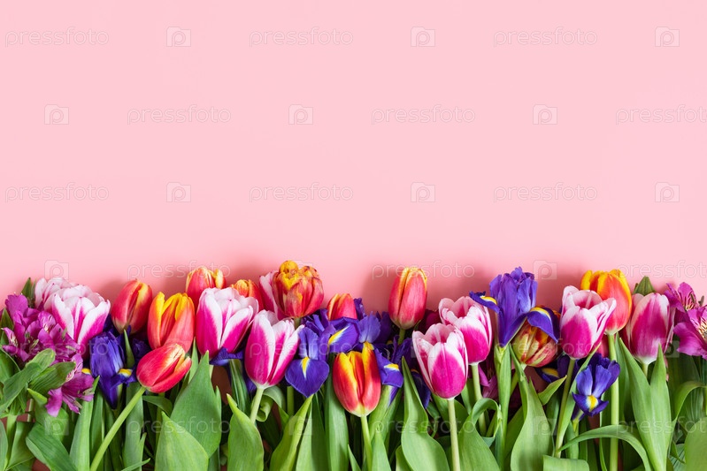 Цветочная композиция. Граница с красочными весенними цветами на пастельно-розовом фоне. День святого Валентина, день матери, концепция женского дня. Скопируйте пространство, вид сверху, плоская планировка