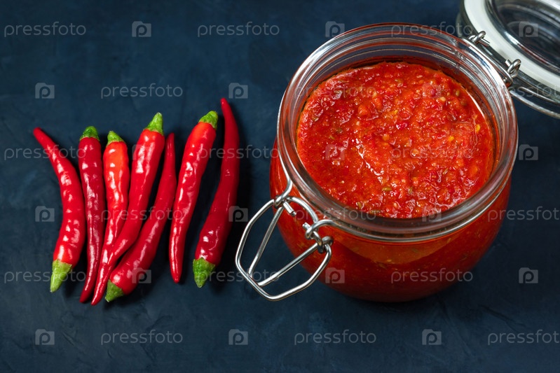 Паста из острого перца чили харисса. Аджика. Традиционная тунисская, грузинская и арабская кухня. Домашняя харисса из роз в стеклянной банке