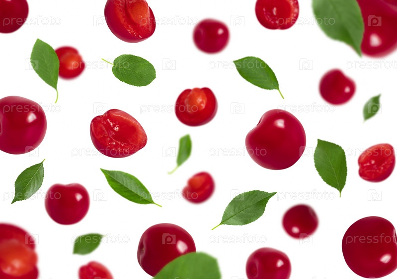 Набор падающих вишен с зелеными листьями, изолированными на белом фоне. Красные ягоды летают в воздухе