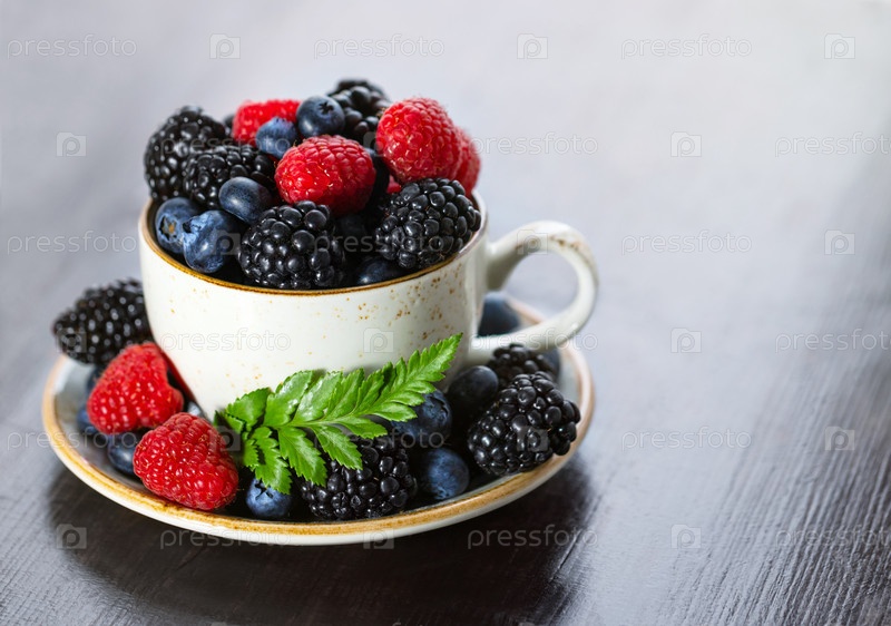 Чашка чая с ягодами крупным планом на деревянном столе. Малина, ежевика, черника в чашке. Летний ягодный микс. Скопируйте пространство