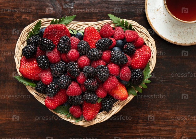 Сердце ягод. Свежая спелая малина, ежевика, клубника и черника на коричневом деревянном фоне в корзине. Ягодный микс