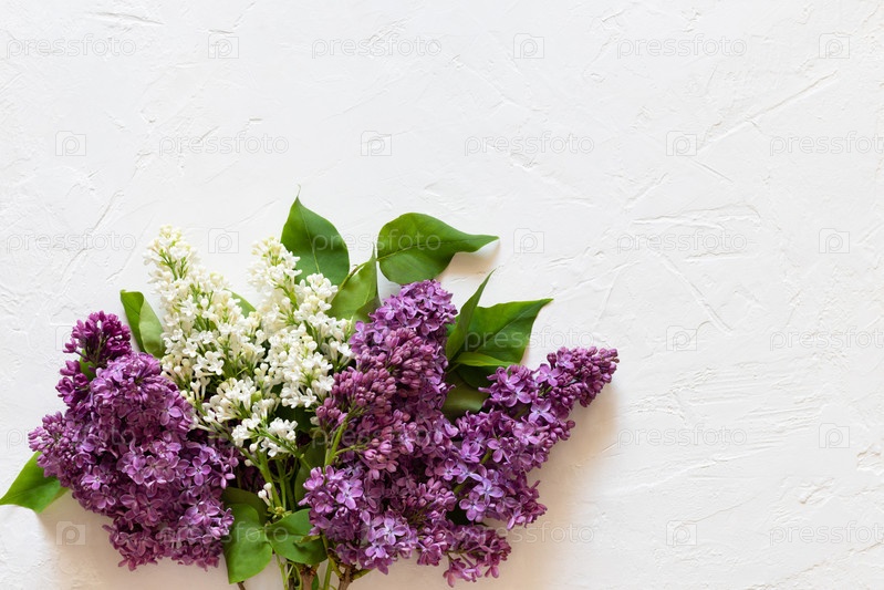 Букет сирени на фоне белого бетона. Весенняя цветочная композиция. Скопируйте пространство, вид сверху