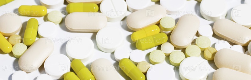 Таблетки и капсулы разных форм и размеров изолированы на белом фоне с жесткими тенями. Концепция медицины и лекарств. Выборочный фокус. Баннер. Вид сверху. Копировать пространство