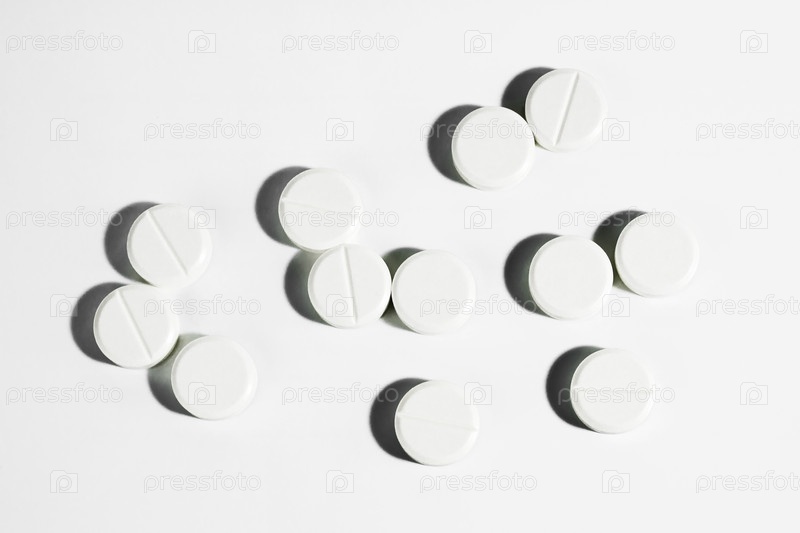 Белые таблетки, изолированные на белом фоне с жесткими тенями. Концепция медицины и наркотиков. Вид сверху. Копировать пространство