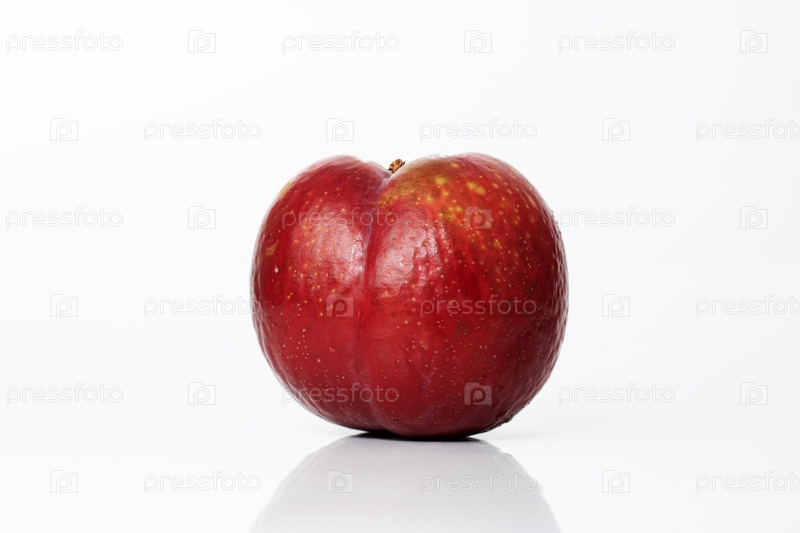 Спелая слива изолирована на белом фоне с тенью и отражением. Перезрелая старая уродливая слива. Испорченная еда
