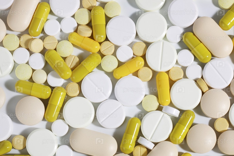 Таблетки и капсулы разных форм и размеров изолированы на белом фоне с жесткими тенями. Концепция медицины и лекарств. Вид сверху. Копировать пространство