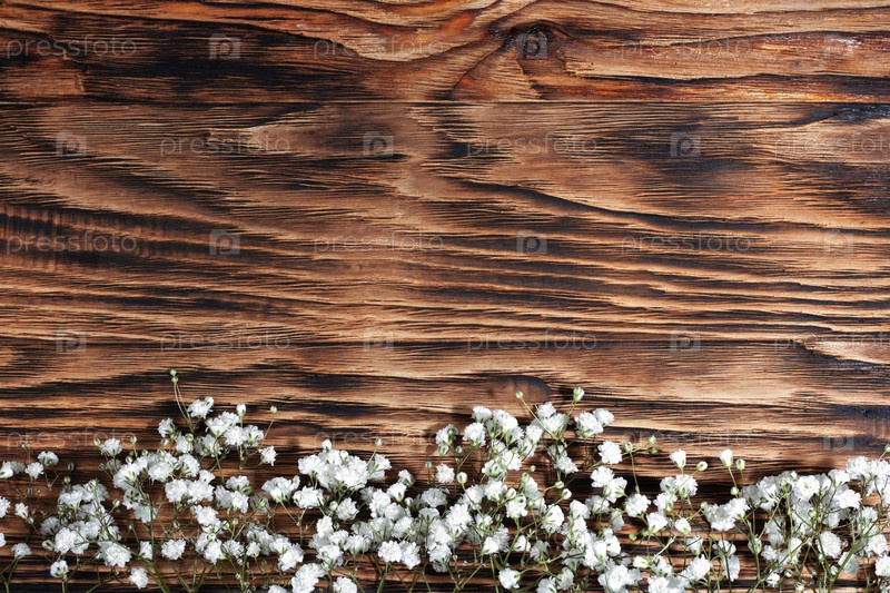 Белые цветы гипсофила с зелеными листьями на старинных деревянных фоне. Эко-фон. Граница. Вид сверху. Скопируйте пространство