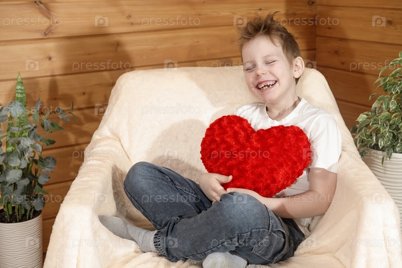 День святого Валентина, дети. Симпатичный маленький мальчик, ребенок держит в руках плюшевое красное сердце, подарок на день святого валентина. Ребенок смеется и веселится. Замедленная съемка