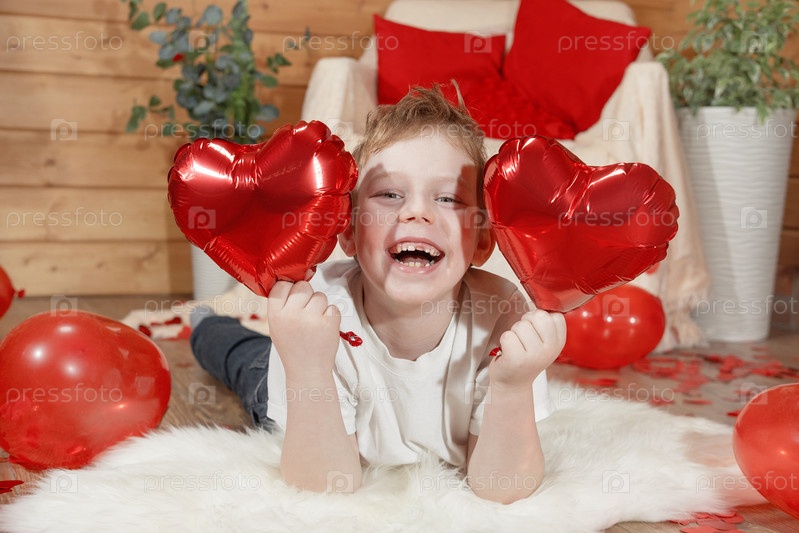 День Святого Валентина дети или дети. Милый радостный маленький мальчик с красными воздушными шарами в форме сердца в День святого Валентина. Поздравление или открытка на День святого Валентина