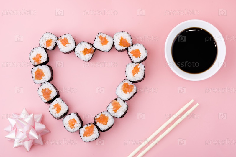 Роллы суши с лососем выложены в форме сердца на розовом фоне. Концепция японской кухни на День святого Валентина, поздравительная открытка, баннер. Копировать пространство