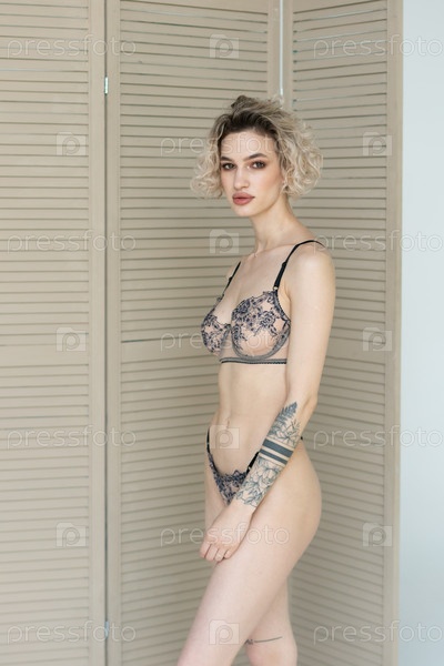 Молодая красивая женщина позирует в бежевом нижнем белье в студии