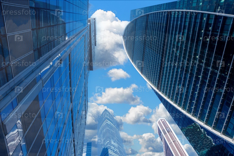 МОСКВА, РОССИЯ - 02 февраля 2021 г.: Москва в солнечный зимний день. Деловой район Москвы в синих тонах зимних огней. Солнечный день в большом городе