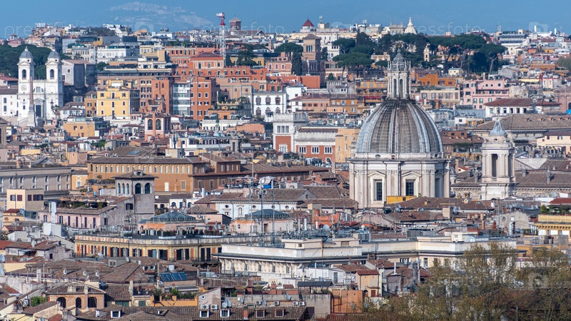 Рим (Италия) - Вид на город с холма Яникул и террасы, с Витториано, церковью Тринита-деи-Монти и дворцом Квиринале
