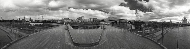 Москва - 23 марта 2020 г.: Панорама плавучего моста в парке "Зарядье" возле Московского Кремля, Россия. Зарядье — туристическая достопримечательность Москвы. Удивительный вид на парящий мост с людьми над Москвой-рекой