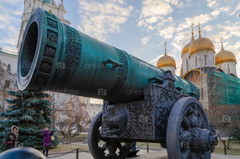 Москва - 22 ноября 2014 г.: Царь-пушка (король пушек) в Московском Кремле, Россия. Это известная туристическая достопримечательность Москвы. Большой исторический памятник с видом на старые соборы в центре города