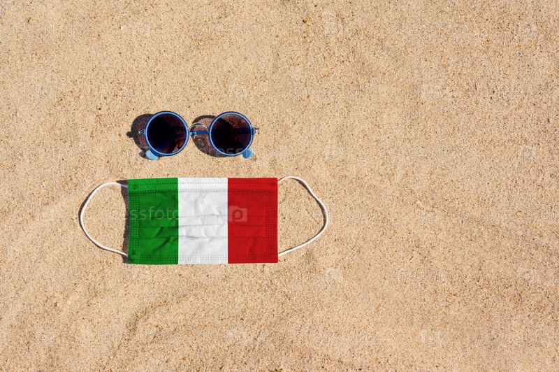 Медицинская маска цвета итальянского флага лежит на песчаном пляже рядом с очками. Концепция организации безопасного пляжного отдыха в Италии в период пандемии коронавируса