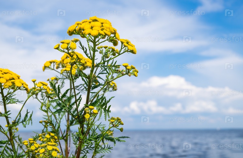 Лекарственное растение пижма на фоне моря и голубого неба с белыми кочевым облаками