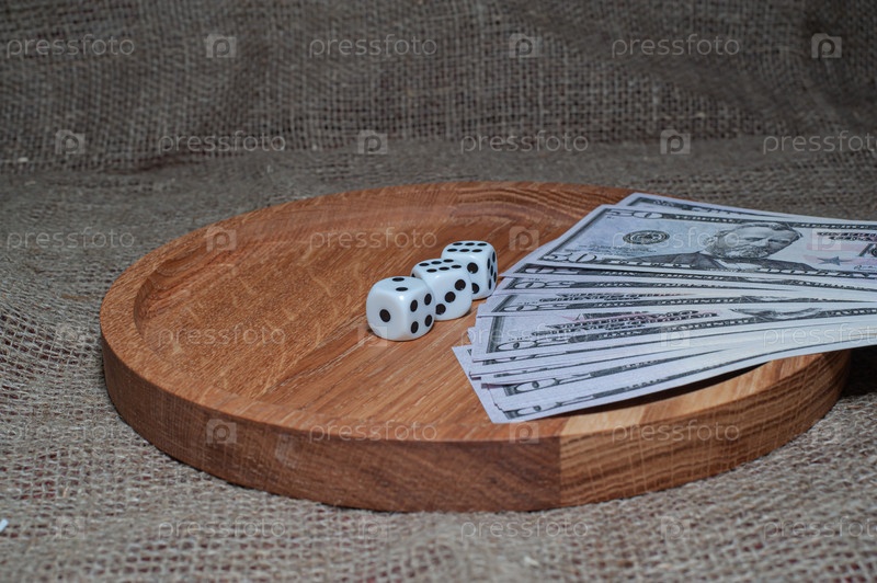 Три кости, лежащие над кучей денег на деревянной тарелке
