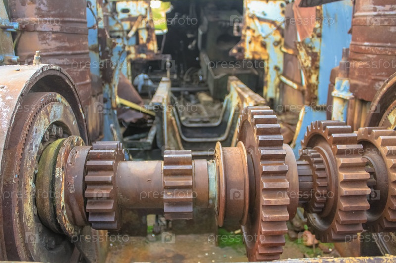 Ржавые шестерни трансмиссии старого разбитого танка крупным планом